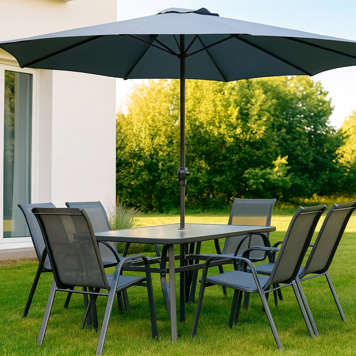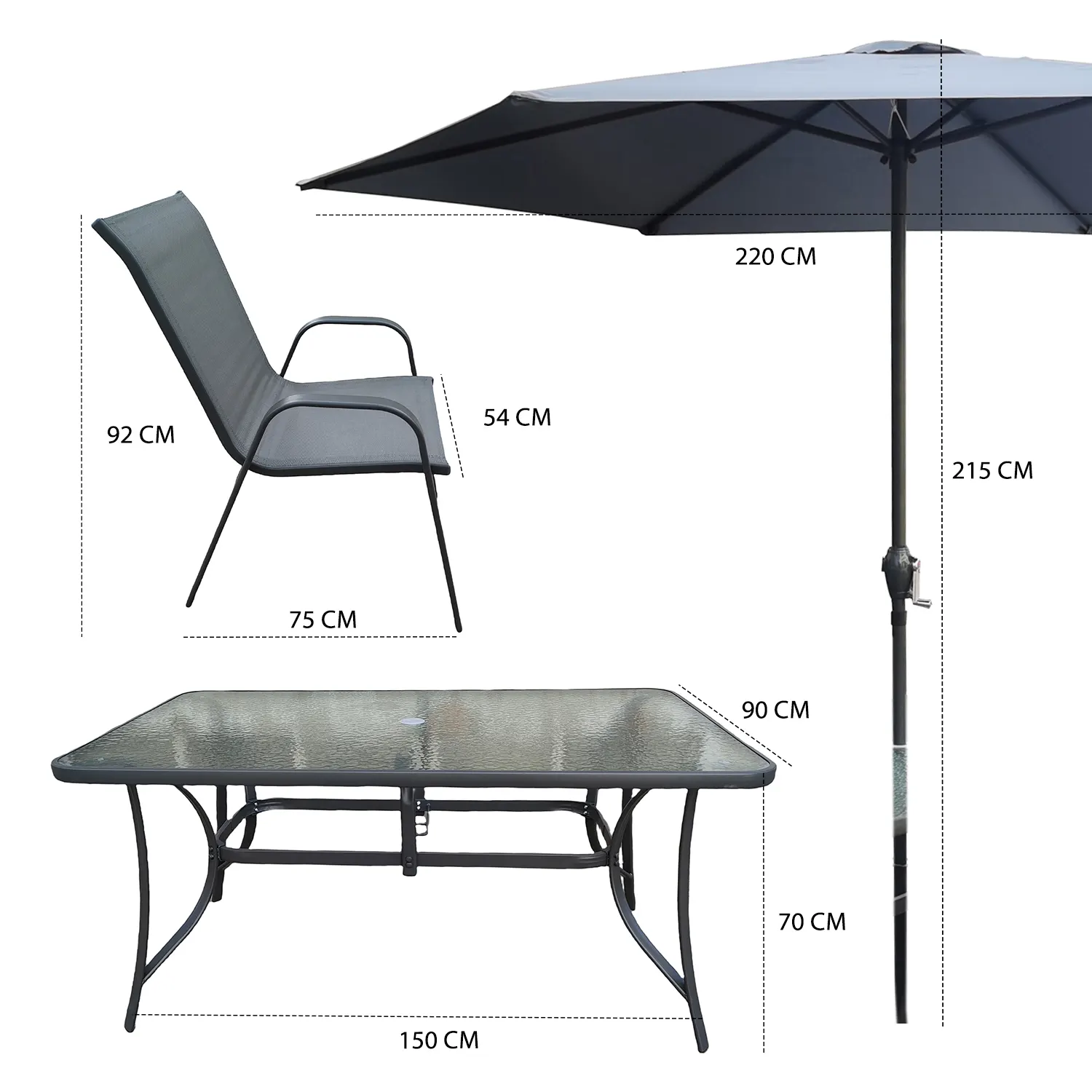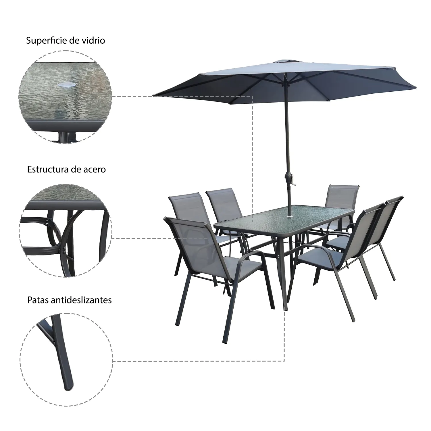 El juego Maceio está pensado para quienes desean un comedor exterior completo y práctico. El quitasol ajustable brinda protección solar, mientras que la mesa de vidrio es resistente y fácil de limpiar. Las sillas con diseño ergonómico garantizan comodidad en cada uso. Es un conjunto perfecto para reuniones familiares, celebraciones con amigos o tardes relajadas en la terraza o jardín, combinando funcionalidad y estética moderna.