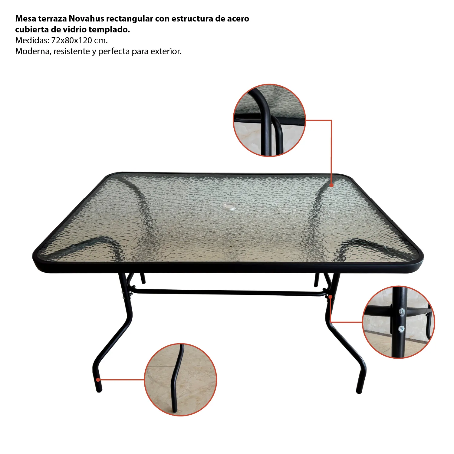 Transforma tus espacios exteriores con la Mesa Terraza Novahus rectangular, diseñada para ofrecer estilo, resistencia y funcionalidad en un solo producto. Su estructura de acero tubular proporciona firmeza y durabilidad, mientras que la cubierta de vidrio templado aporta un acabado moderno y elegante, ideal para almuerzos, cenas o momentos de relajo en terrazas, jardines o balcones. Gracias a su formato rectangular y diseño atemporal, se adapta fácilmente a diferentes estilos decorativos y necesidades.