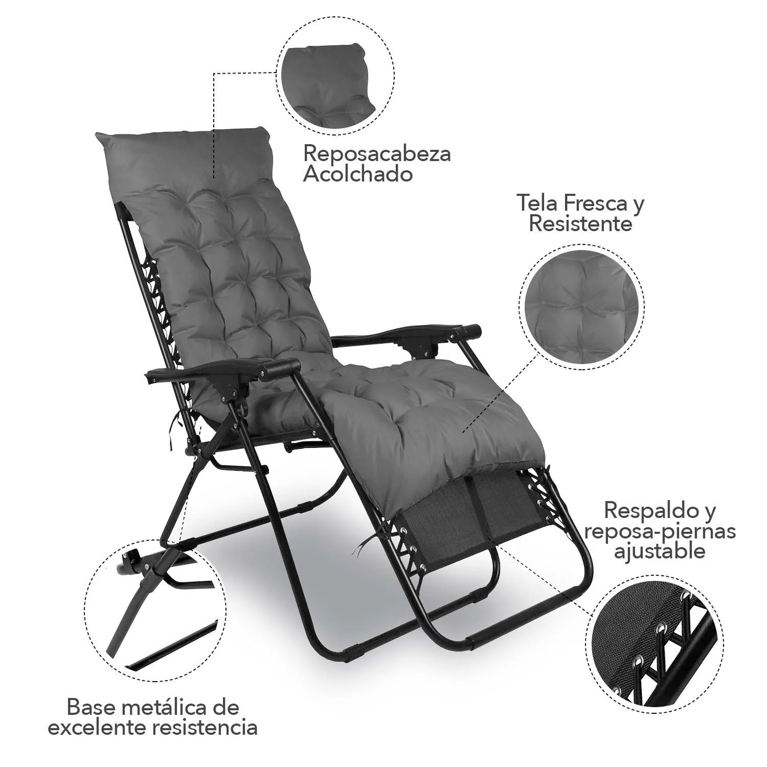 Disfruta del máximo confort al aire libre con nuestra Reposera Plegable con Acolchado, una fusión perfecta de resistencia, calidad y diseño. Construida con un robusto tubo de hierro que garantiza durabilidad y estabilidad, esta reposera es tu compañera ideal para momentos de relajación. La tela oxford de alta resistencia y poliéster no solo añade a su elegante diseño, sino que también proporciona una sensación acogedora.Su superficie antideslizante asegura una experiencia segura en cualquier entorno, mientras que su función reclinable te permite encontrar la posición perfecta para tus momentos de descanso. Además, su característica plegable la convierte en una opción versátil y práctica. Descubre el lujo de relajarte al aire libre con nuestra Reposera Plegable con Acolchado.Especificaciones:Material de la Estructura: Tubo de hierro.