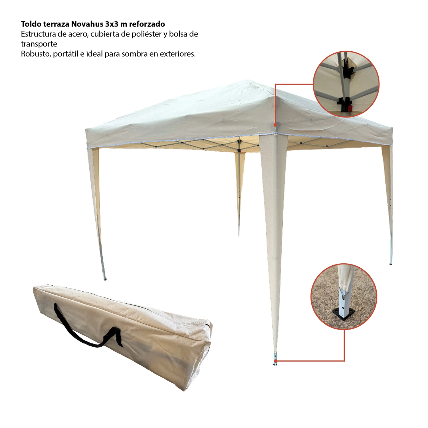 Disfruta al máximo tus espacios exteriores con el Toldo Terraza Reforzado Novahus 3×3 m, diseñado para ofrecer sombra y protección de manera práctica y duradera. Su estructura de tubo de acero proporciona firmeza y estabilidad, mientras que su cubierta de poliéster resiste el sol y el uso frecuente. Este modelo incluye una bolsa de transporte, ideal para guardar, llevar o almacenar fácilmente el toldo cuando no se utiliza. Perfecto para terrazas, jardines, campings, ferias o cualquier espacio al aire libre.